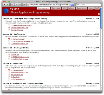 スタンフォード大学がClass CS193P: iPhone Application Programmingとして、iPhoneアプリケーションの開発講座の教材を公開しています。全20回の予定らしく、現時点では第12回までが公開されています。平易な英文で図版も多く、ソースコードも公開されていますから、これはマストハブですね。